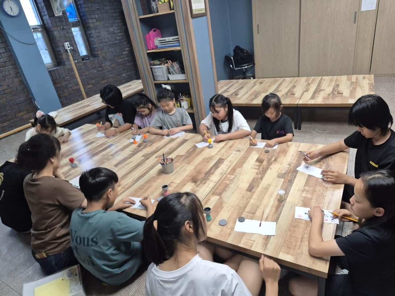 이번 미술 프로그램은 단순히 그림을 그리는 데서 그치지 않고, 아이들이 각자의 감정을 표현하고 서로의 작품을 공유하면서 자연스럽게 소통하는 장이 되었습니다. 사진 속 아이들은 나무 테이블에 둘러앉아 집중하는 모습이 매우 진지하고 열정적이었습니다. 다양한 색상의 물감과 크레파스, 연필 등을 활용해 각자 개성 있는 작품을 완성해 나가는 모습이 보기 좋았습니다.